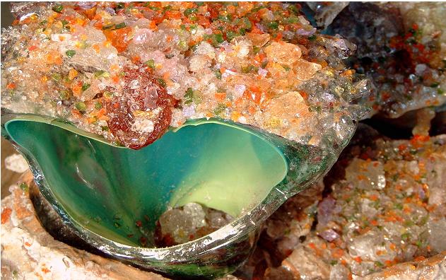 Rockriver captures the precise high temperature moment at which new geological phenomena are being born and reveals the marvelous explosive interior of a geochemical formation. By combining a variety of methods- including glass columns with a crystalline core, calcite cave formations, crystal glazed slabs, salt-blown spheres, ceramic blown glass vessels, and sandcast rocks-she creates narrative landscapes, which she calls Geochemical Sculpture.