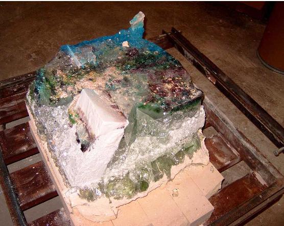 After removing the furnace wall, a planetary mantle is revealed. This cooled glass block captures the layered growth process and maturation of silica, copper, cobalt, titanium, iron, calcium, and alumina.