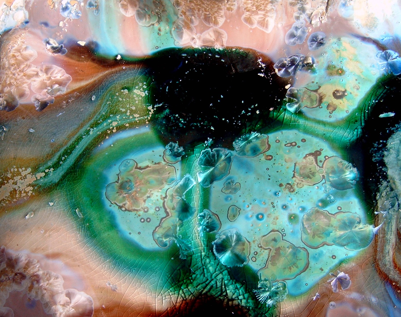 At a steady kiln temperature of 2000 degrees F, crystalline glazes mature and develop complex crystal formations that capture the moment when a liquid transforms into a solid.