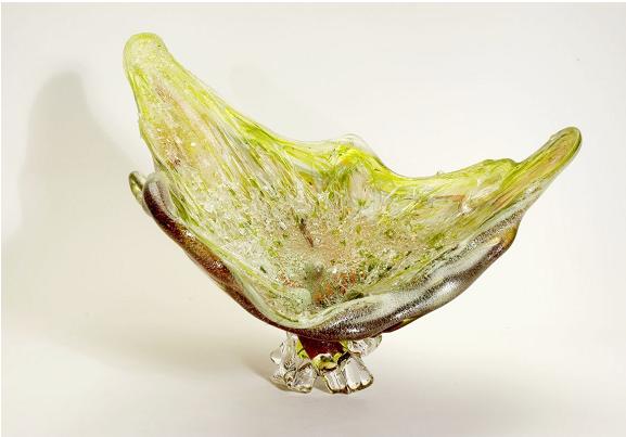 Dried ceramic glazes are poured into a glass vessel during the blowing process. They bubble, fuse, melt, and crystallize. The surface texture varies according to the chemical makeup of the glazes as well as ranges of time and temperature in the glory hole.