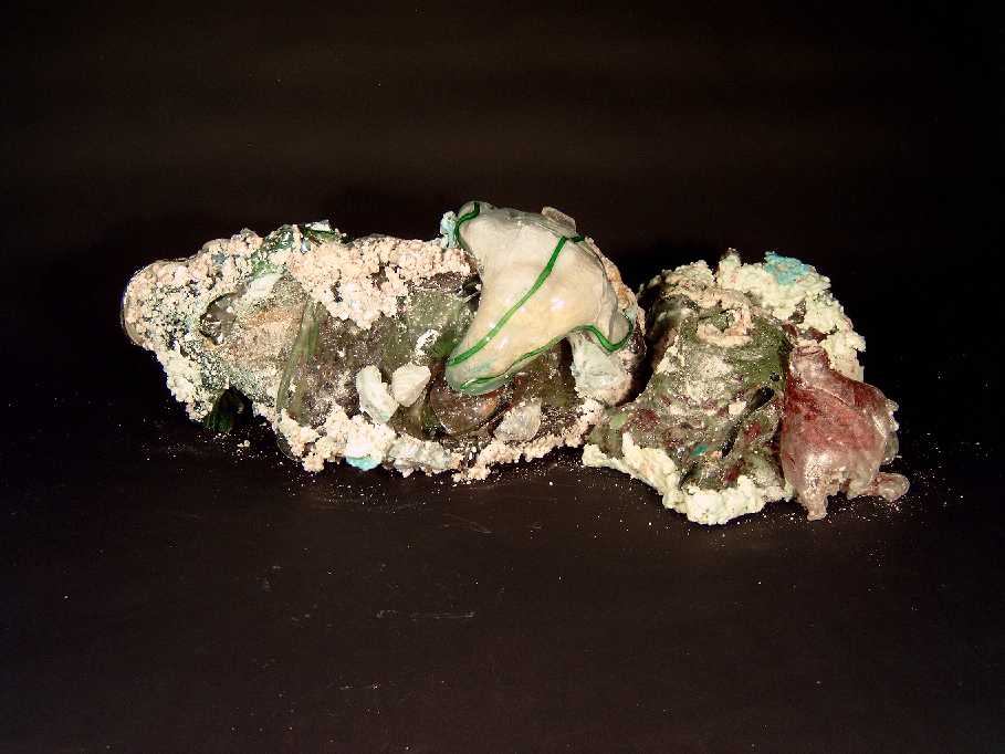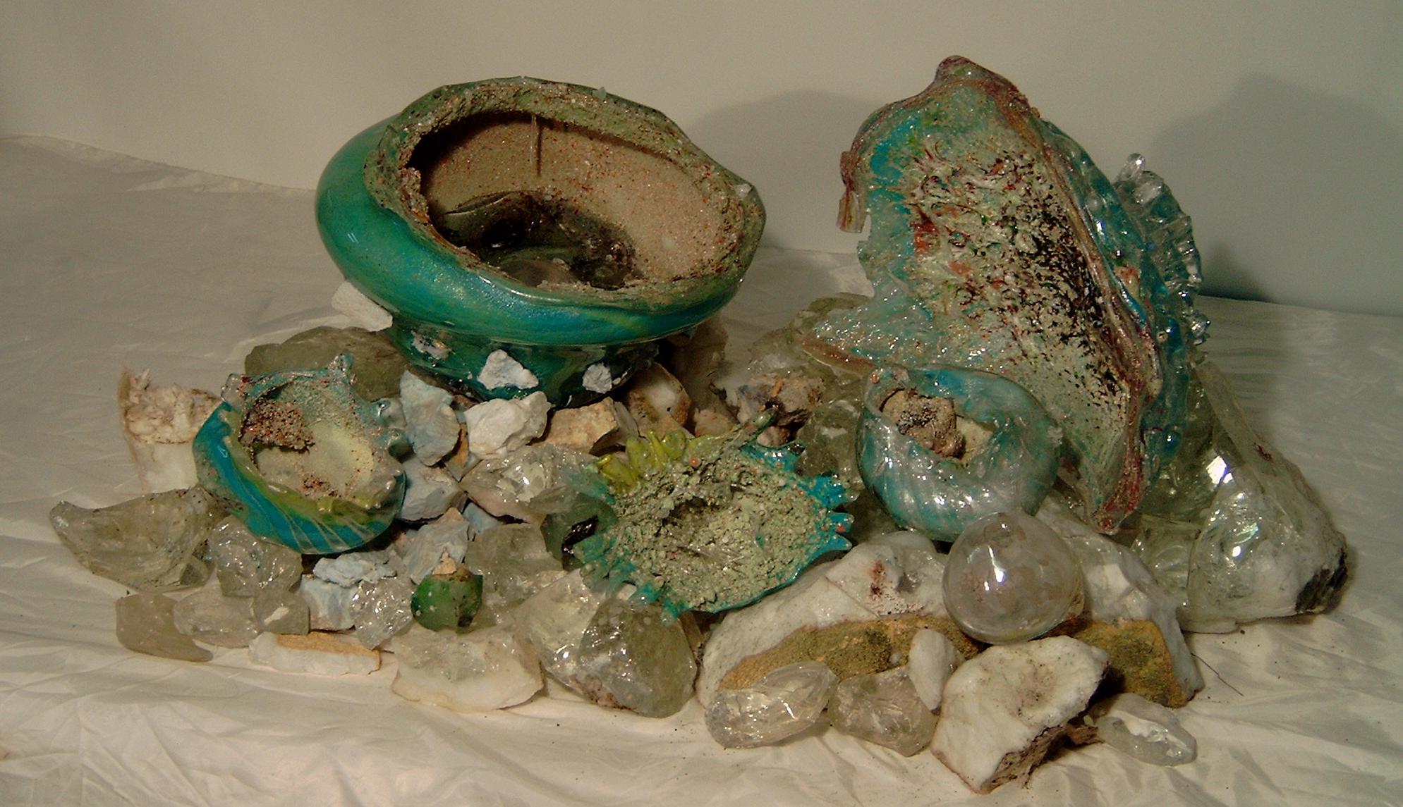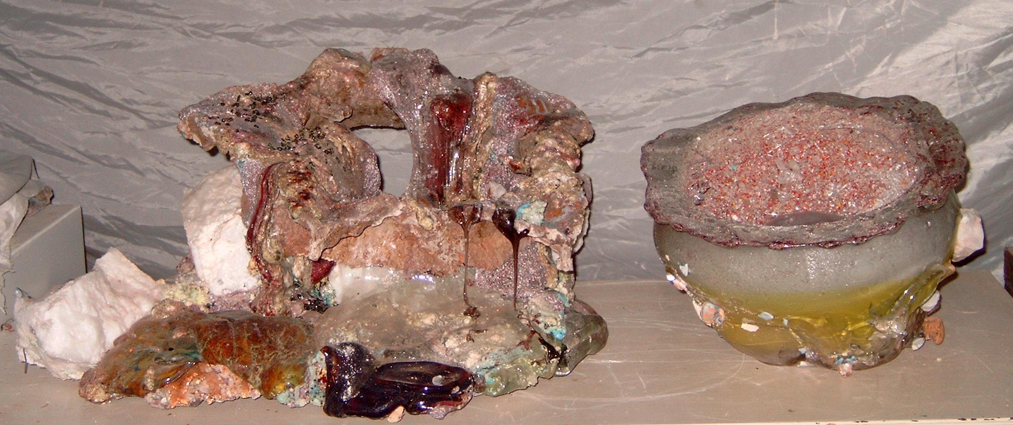 Works incorporate blown glass, ceramic sculptures, glazed kiln bricks, and glory hole floors. I place chemicals into the hot glass and control the melting and cooling of these materials. Spinning and dripping materials encrust the glory hole and kiln floors. I harvest these foundations and nest the vessels in them. Finished works include the environment from which they were born. They are a geological landscape of imaginary planets.