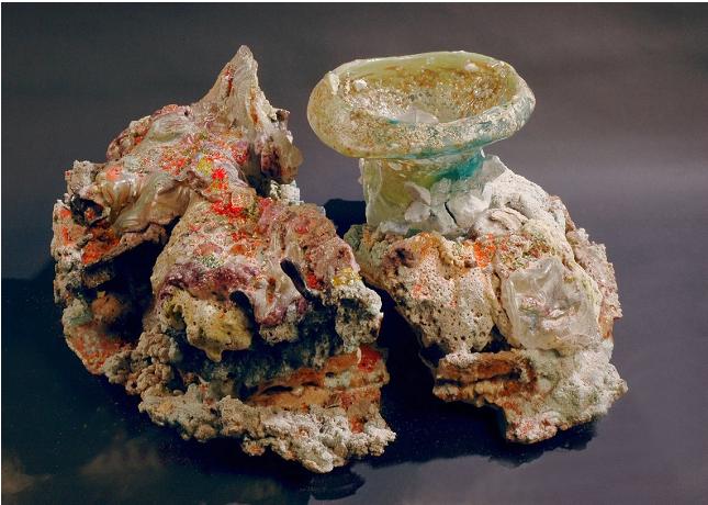 A blown glass vessel erupts from the surface of a jewel-encrusted ground.
